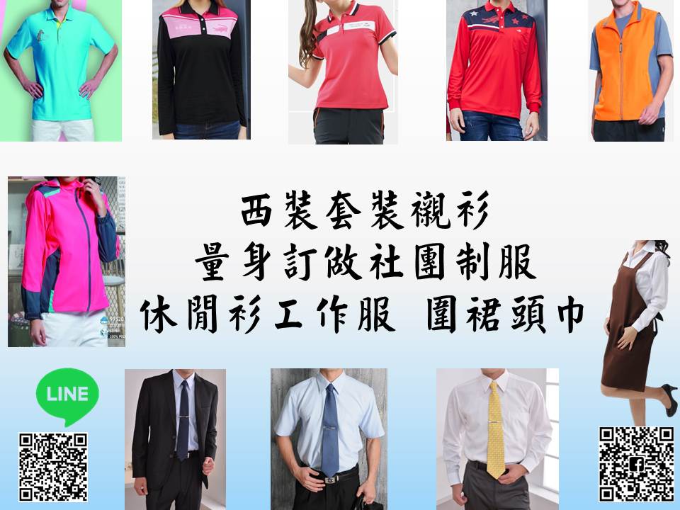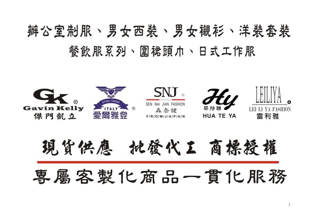 量身訂作男女西服、男女西裝背心、男女襯衫、西褲、裙子、洋裝、工作服、POLO衫、T恤、圍裙、頭巾、餐飲服系列等、各種帽子、防曬小物、以專業量身配布採樣以創作最符合您的風格衣物。